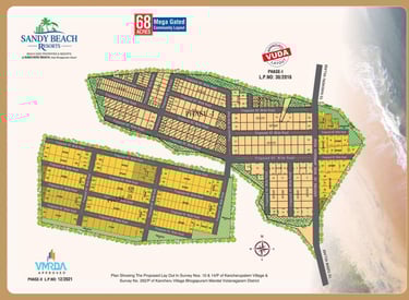 Nestled in the serene coastal village of Kancheru, Bhogapuram, Sandy Beach Resorts is an exclusive destination featuring premium open plots and a luxurious resort experience. Just minutes away from the upcoming Greenfield International Airport, this 68-acre coastal paradise is surrounded by breathtaking beach scenery, offering a perfect escape from the everyday.