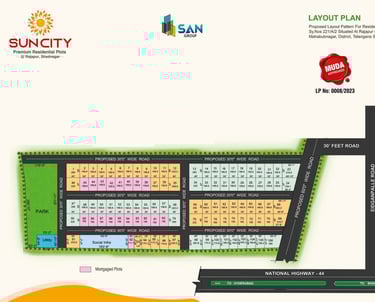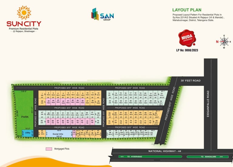 Located in the peaceful environs of Rajapur, Shadnagar, SUN CITY is a premium residential plotting project spread across 7.11 acres. Surrounded by nature and featuring well-planned infrastructure, modern amenities, and a vibrant neighborhood, it’s the perfect place to build your dream home and enjoy villa-style living.